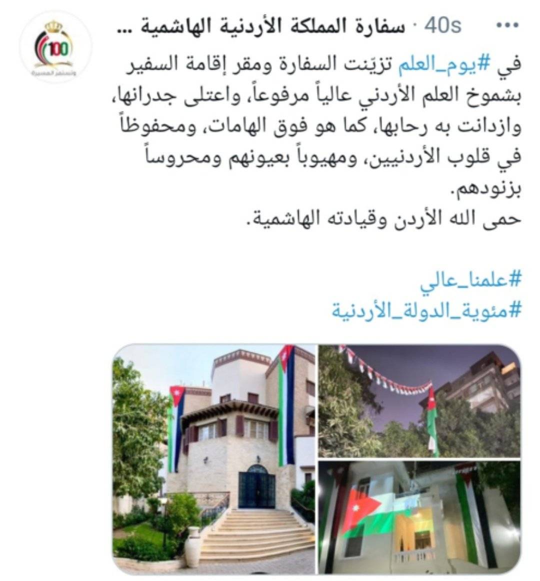 "في #يوم_العلم تزيّنت السفارة ومقر إقامة السفير بشموخ العلم الأردني عالياً مرفوعاً، واعتلى جدرانها، وازدانت به رحابها، كما هو فوق الهامات، ومحفوظاً في قلوب الأردنيين، ومهيوباً بعيونهم ومحروساً بزنودهم. حمى الله الأردن وقيادته الهاشمية”.