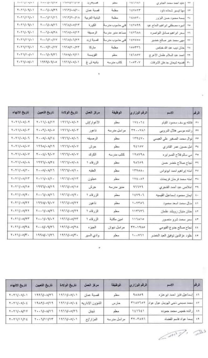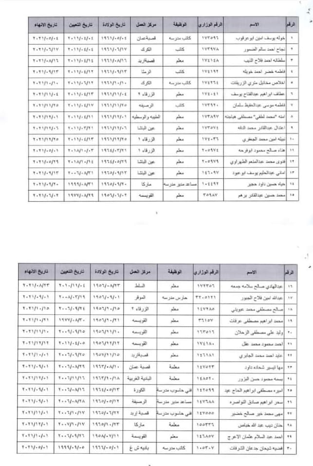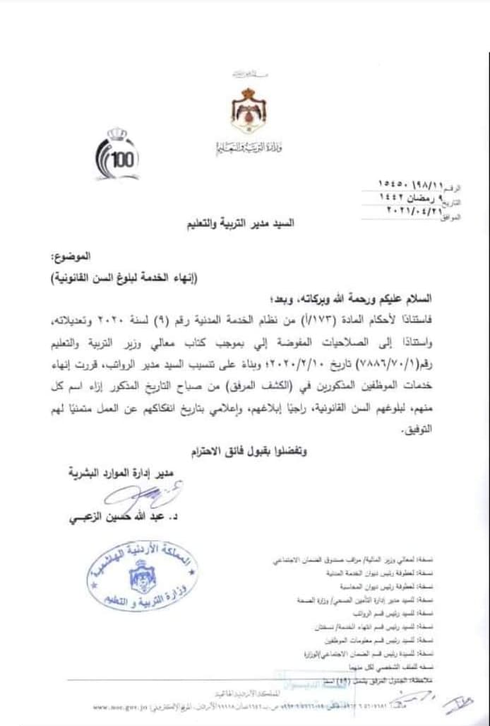: قرر وزير التربية والتعليم وبناء على تنسيب مدير الرواتب انهاء خدنات المذكورين اعتبارا من التاريخ المذكور ازاء اسم كل منهم لبلوغهم السن القانونية .