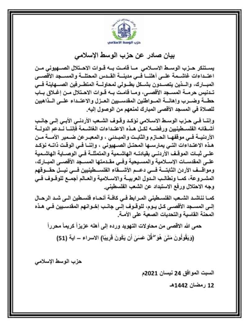 وإننا في حزب الوسط الاسلامي نؤكد وقوف الشعب الأردني الأبي إلى جانب أشقائه الفلسطينيين ورفضه لكل هذه الاعتداءات الغاشمة فإننا ندعم الدولة الأردنية في موقفها الحازم والثابت والمبدئي ، والمعبرعن ضمير الأمـة من هذه الاعتداءات التي يمارسها المحتل الصهيوني ، وإننا في الوقت ذاته نؤكد على ثبات الموقف الأردني بقيادته الهاشمية والمتمثلة في الوصاية الهاشمية على المقدسات الإسلامية والمسيحية وفي مقدمتها المسجد الأقصى المبارك، ومواقف الأردن الثابتة في دعم الأشقاء الفلسطينيين في نيل حقوقهم المشروعة، كما ونطالب الدول العربية والاسلامية والعالم أجمع للوقوف في وجه الاحتلال ورفع الاستبداد عن الشعب الفلسطيني.