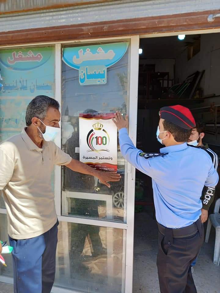 حيث قامت الشرطة المجتمعية في مركز امن بادية سما السرحان بمديرية شرطة البادية الشمالية بتوزيع العلم الأردني على المواطنين ووضع لوحات تحمل شعار مئوية تأسيس الدولة الأردنية على المحال التجارية في الوسط التجاري وعلى سائقي المركبات الذي عبروا عن فخرهم بالمناسبات الوطنية.