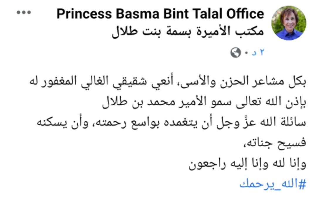 نعت سمو الأميرة بسمة بنت طلال شقيقها الأمير محمد الذي وافته المنية اليوم الخميس.