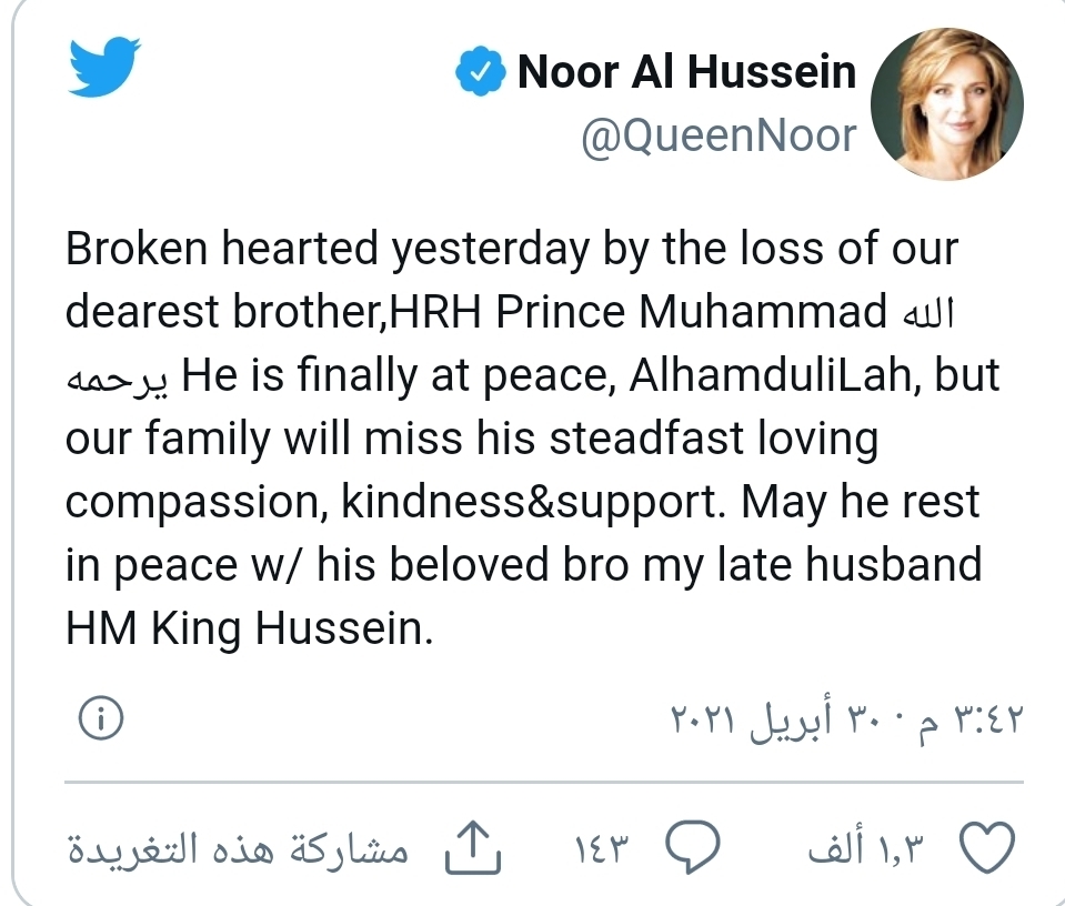 وغردت الملكة نور عبر حسابها الرسمي على موقع "تويتر" للتواصل الاجتماعي: "لقد تحطمت قلوبنا بالأمس لفقدان أخينا العزيز، صاحب السمو الملكي الأمير محمد الله يرحمه، لقد أصبح أخيرا في سلام، ولكن عائلتنا ستفتقد عطفه المحب الصامد ولطفه ودعمه".