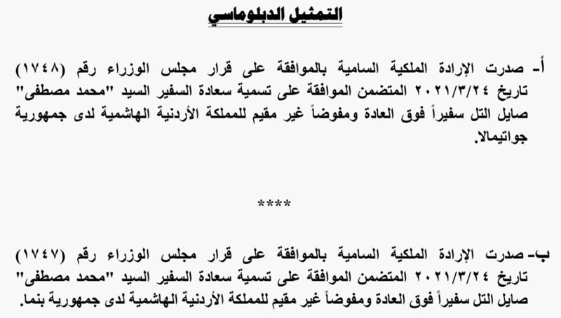 صدرت الارادة الملكية السامية، بالموافقة على قرار مجلس الوزراء، المتضمن تعيين السفير محمد مصطفى صايل التل، سفيراً فوق العادة للأردن لدى جمهورية جواتيملا.