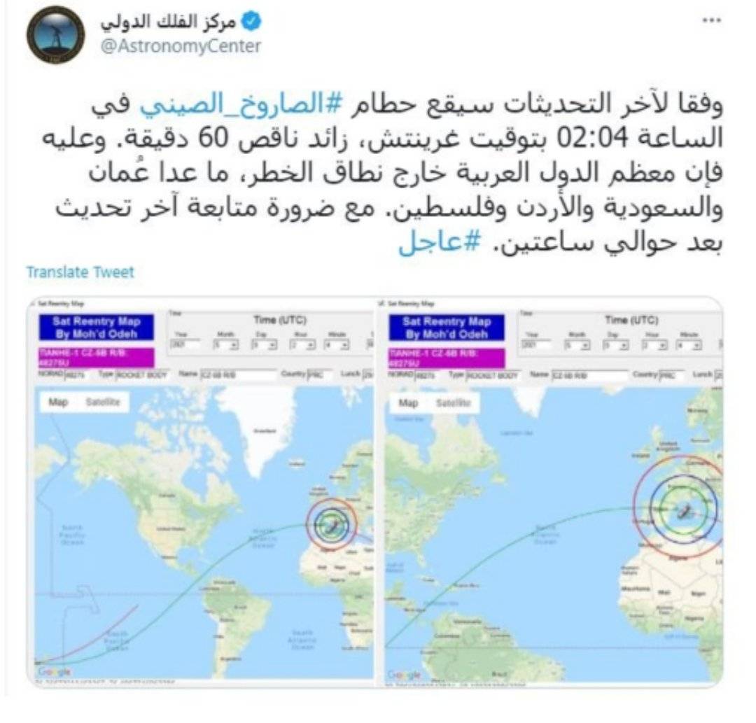 وقال المركز في تغريدة عبر حسابه الرسمي على منصة "تويتر": "وفقا لآخر التحديثات سيقع حطام الصاروخ الصيني في الساعة 02:04 بتوقيت غرينتش، زائد ناقص 60 دقيقة".