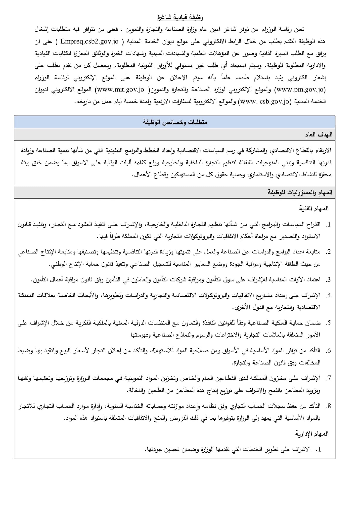 وسيتم استبعاد أي طلب غير مستوفي للأوراق الثبوتية المطلوبة، ويحصل كل من تقدم بطلب على إشعار الكتروني يفيد باستلام طلبه، علماً بأنه سيتم الإعلان عن الوظيفة على الموقع الإلكتروني لرئاسة الوزراء (www.pm.gov.jo) والموقع الإلكتروني لوزارة الصناعة والتجارة والتموين( www.mit.gov.jo) الموقع الالكتروني لديوان الخدمة المدنية (www. csb.gov.jo) والمواقع الالكترونية للسفارات الأردنية ولمدة خمسة أيام عمل من تاريخه.