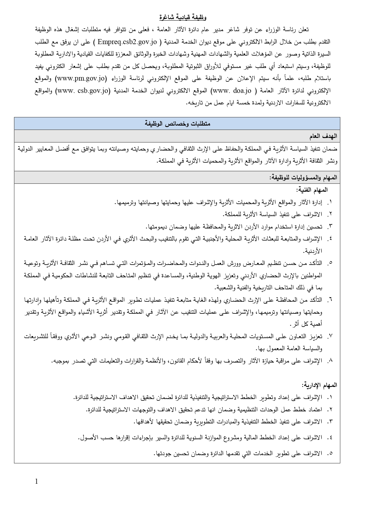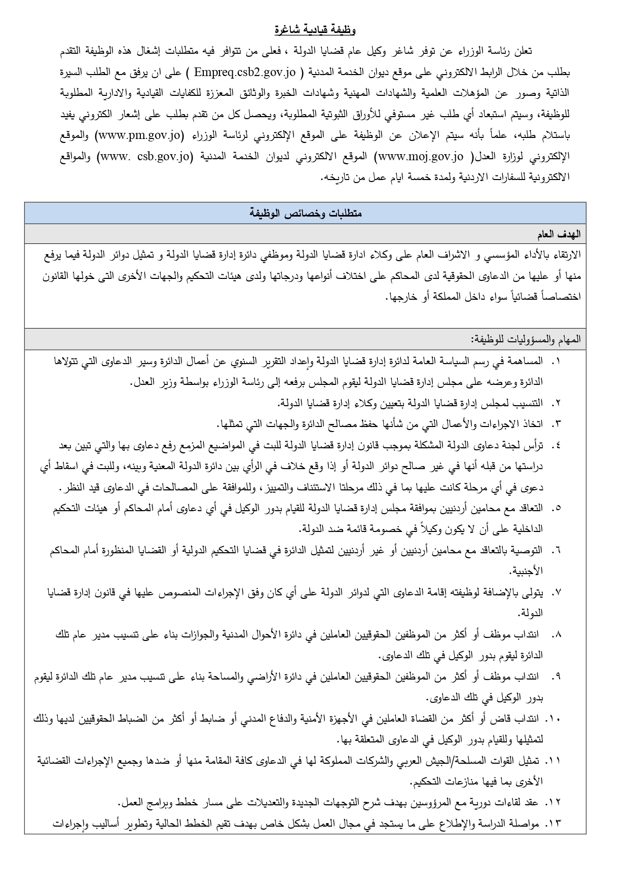 ودعت من تتوافر فيه متطلبات إشغال هذه الوظيفة التقدم بطلب من خلال الرابط الالكتروني على موقع ديوان الخدمة المدنية ( Empreq.csb2.gov.jo ) على ان يرفق مع الطلب السيرة الذاتية وصور عن المؤهلات العلمية والشهادات المهنية وشهادات الخبرة والوثائق المعززة للكفايات القيادية والإدارية المطلوبة للوظيفة.