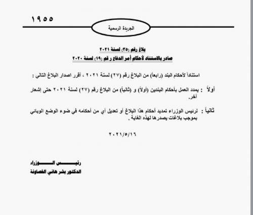 مدد البلاغ رقم 35 لسنة 2021 الصادر عن الحكومة اليوم الثلاثاء، إغلاق قطاعات حتى اشعار آخر.
