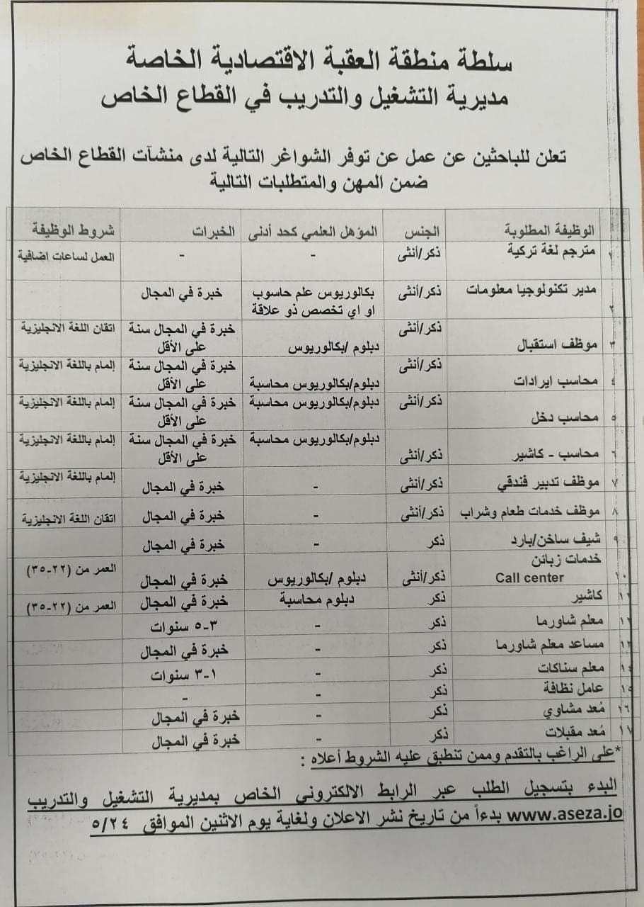 تعلن سلطة منطقة العقبة الاقتصادية الخاصة عن توفر فرص عمل للباحثين من خلال مديرية التشغيل والتدريب في القطاع الخاص .
