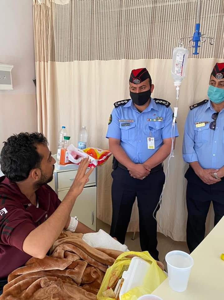 بدوره قام فرع الشرطة المجتمعية في مديرية شرطة محافظة إربد ومندوب مكاتب إدارة شؤون المتقاعدين بزيارة متقاعدي الأمن العام الذين يرقدون على سرير الشفاء في مستشفى الأمير راشد بن الحسن العسكري للإطمئنان على صحتهم ونقل تحيات عطوفة مدير الأمن العام وتمنياته لهم بالشفاء وتقديم هديه وبطاقة تهنئة بالشفاء العاجل .