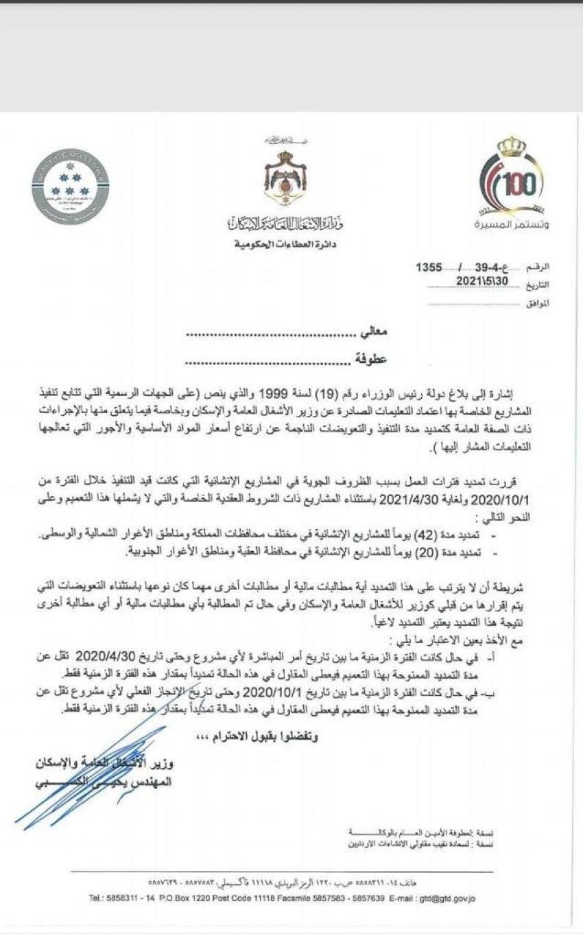 وبين الكسبي في تعميمه أنه سيتم تمديد مدة 42 يوما للمشاريع الانشائية وفي مختلف محافظات المملكة و 20 يوما للمشاريع في العقبة والاغوار الجنوبية.