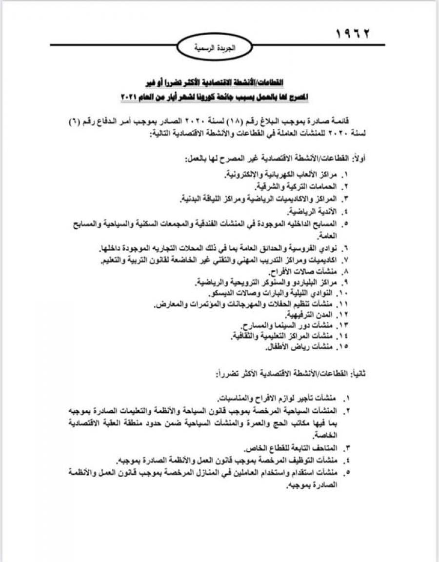 أصدرت رئاسة الوزراء قائمة القطاعات والأنشطة الاقتصاديّة الأكثر تضرّراً أو غير المصرّح لها بالعمل بسبب جائحة كورونا لشهر أيّار ٢٠٢١م.