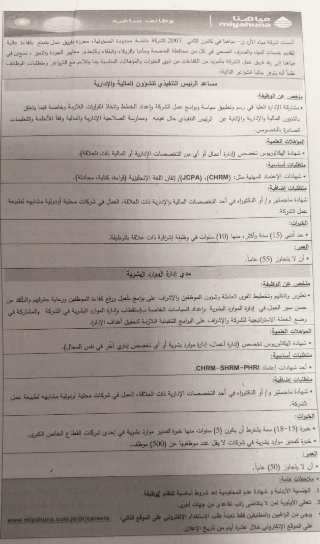 أعلنت شركة مياه الأردن – مياهنا الأربعاء، عن توفر و ظيفتين شاغرتين.