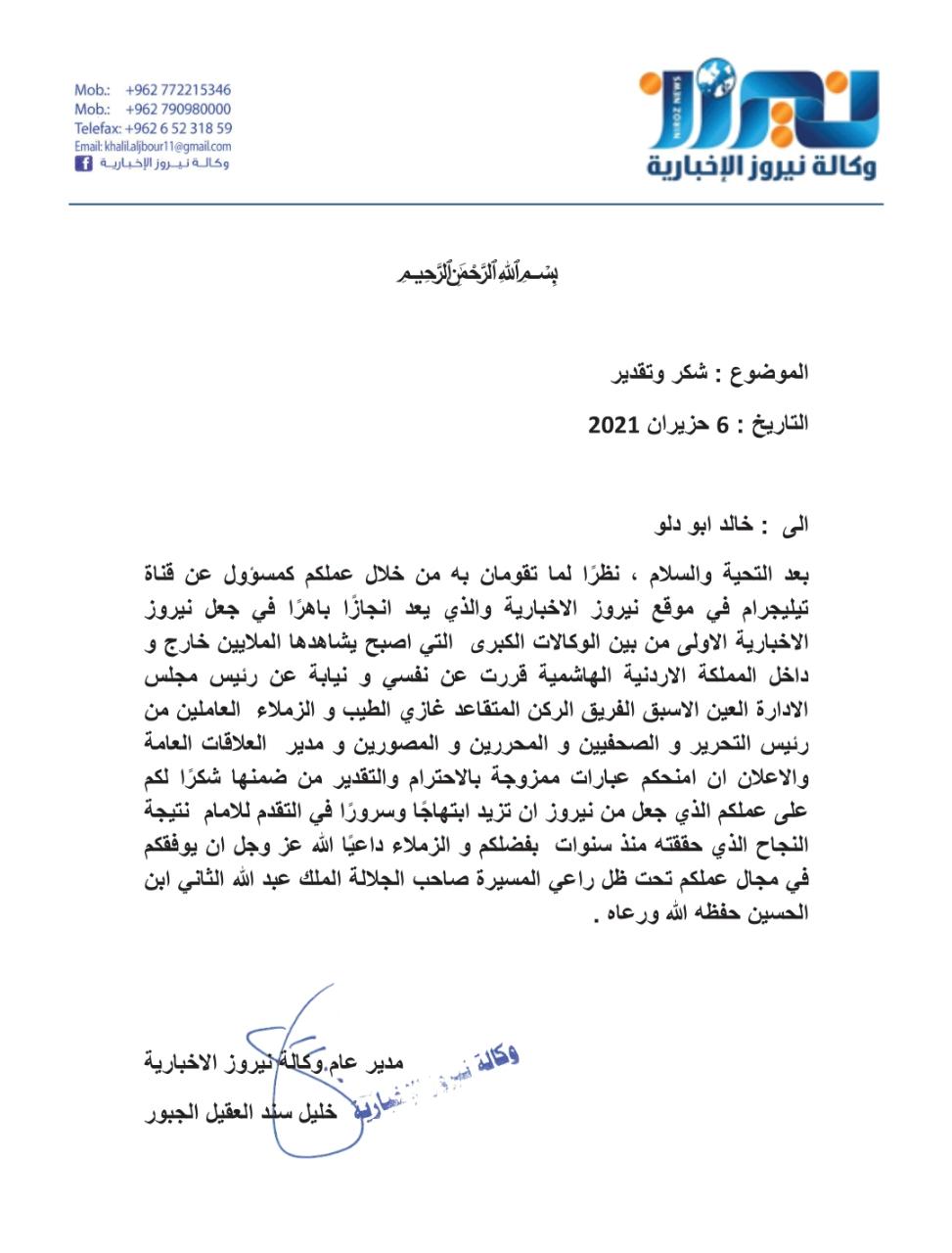 اعربت نيروز الاخبارية برسالة وجهها المدير العام الاعلامي خليل سند العقيل الجبور اليوم الإثنين لمسؤول قناة تيليجرام السيد خالد ابو دلو لتفانيه واخلاصه في مجال عمله في إدارة القناة التي لاقت اعجابًا كبيرًا من متابعيها .