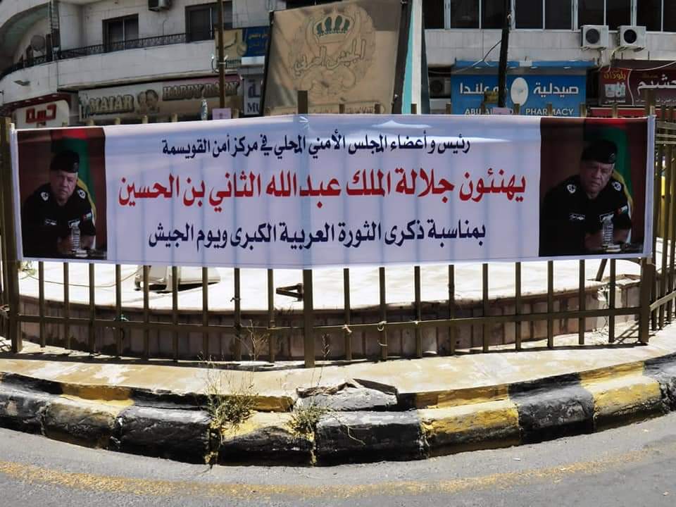 فيما قامت الشرطة المجتمعية في مديرية شرطة شرق عمان وشمال عمان بتعليق يافطات التهنئة بالمناسبات الوطنية ضمن اختصاص الأشرفية والقويسمة وأبو نصير بالتنسيق مع أعضاء المجالس الأمنية المحلية لديهم .