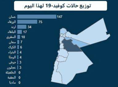 يذكر ان الأردن سجل 310 إصابات في الساعات الـ 24 الماضية ، جاء توزيعها بحسب الرسم البياني المرفق.