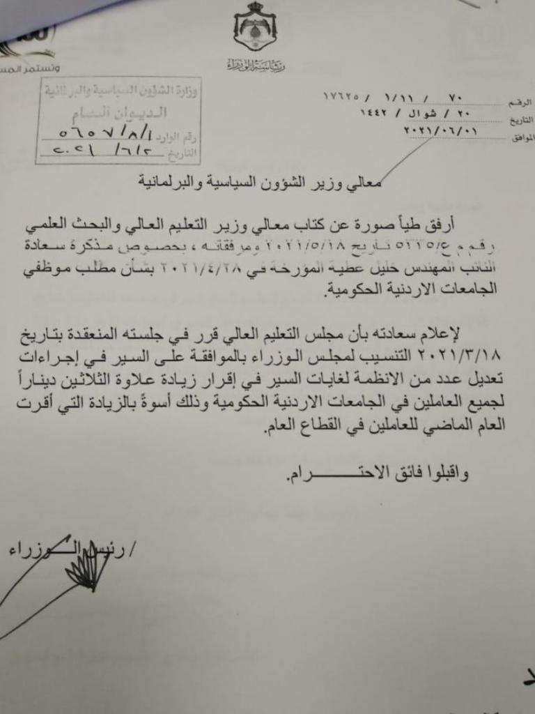 من جهته ردّ رئيس الوزراء الدكتور بشر الخصاونة على مذكرة النائب خليل عطية عبر وزير الشؤون السياسية والبرلمانية موسى المعايطة، قال فيه أن مجلس التعليم العالي قرر في جلسته المنعقدة بتاريخ 18/3/2021 التنسيب لمجلس الوزراء بالموافقة على السير في إجراءات تعديل عدد من الأنظمة لغايات السير في إقرار زيادة علاوة 30 ديناراً لجميع العاملين في الجامعات الحكومية الأردنية، أسوة بالزيادات التي أقرت لموظفي القطاع العام في العام الفائت.
