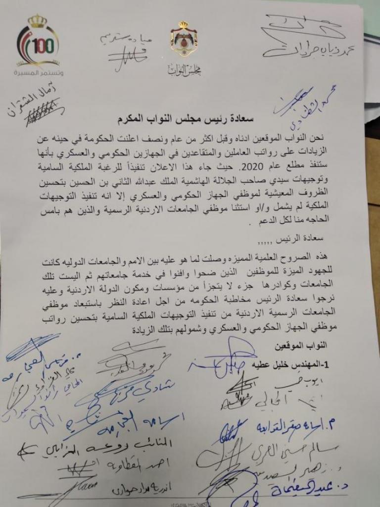 وقال عطية في مذكرته التي وجهها للحكومة أن التوجيهات الملكية استثنت موظفي الجامعات الرسمية، داعياً الحكومة إلى إعادة النظر في استثناء موظفي الجامعات من الزيادات، كونهم بحاجة الى الدعم، ولأن الجامعات الرسمية جزء لا يتجزأ من مؤسسات الدولة.