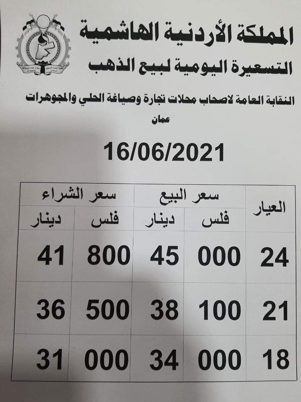 ويشمل التقريــر أسعار المعدن عيارات ( 24، 21، 18) ، كونها الأكثر تداولا في الأردن.