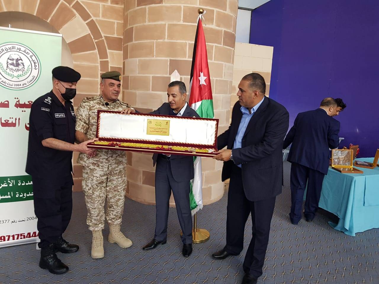 تحت رعاية محافظ العقبة محمد الرفايعة اقامت جمعيه صقور الاردن التعاونيه "مبادره تراب الوطن غالي" حفلا تكريميا لعدد من قيادات الأجهزة الأمنية والعسكرية في محافظة العقبة وذلك بمناسبة احتفالات المملكه بعيد الاستقلال الخامس والسبعين ومئوية الدولة الأردنية تقديرا للدور الكبير للقوات المسلحة الأردنية الجيش العربي والأجهزة الأمنية بمختلف مسمياتها .