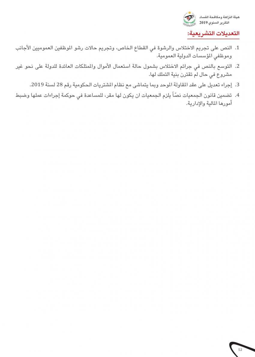 نشرت هيئة النزاهة ومكافحة الفساد تقريرها السنوي لعام 2019 والذي تناولت فيه اهم إنجازاتها، وذلك من خلال المحاور الرئيسة التي تتضمن: إنفاذ القانون، تعزيز النزاهة، التوعية والوقاية، حماية المبلغين والشهود والمخبرين، التعاون الدولي، والاسترداد المالي.