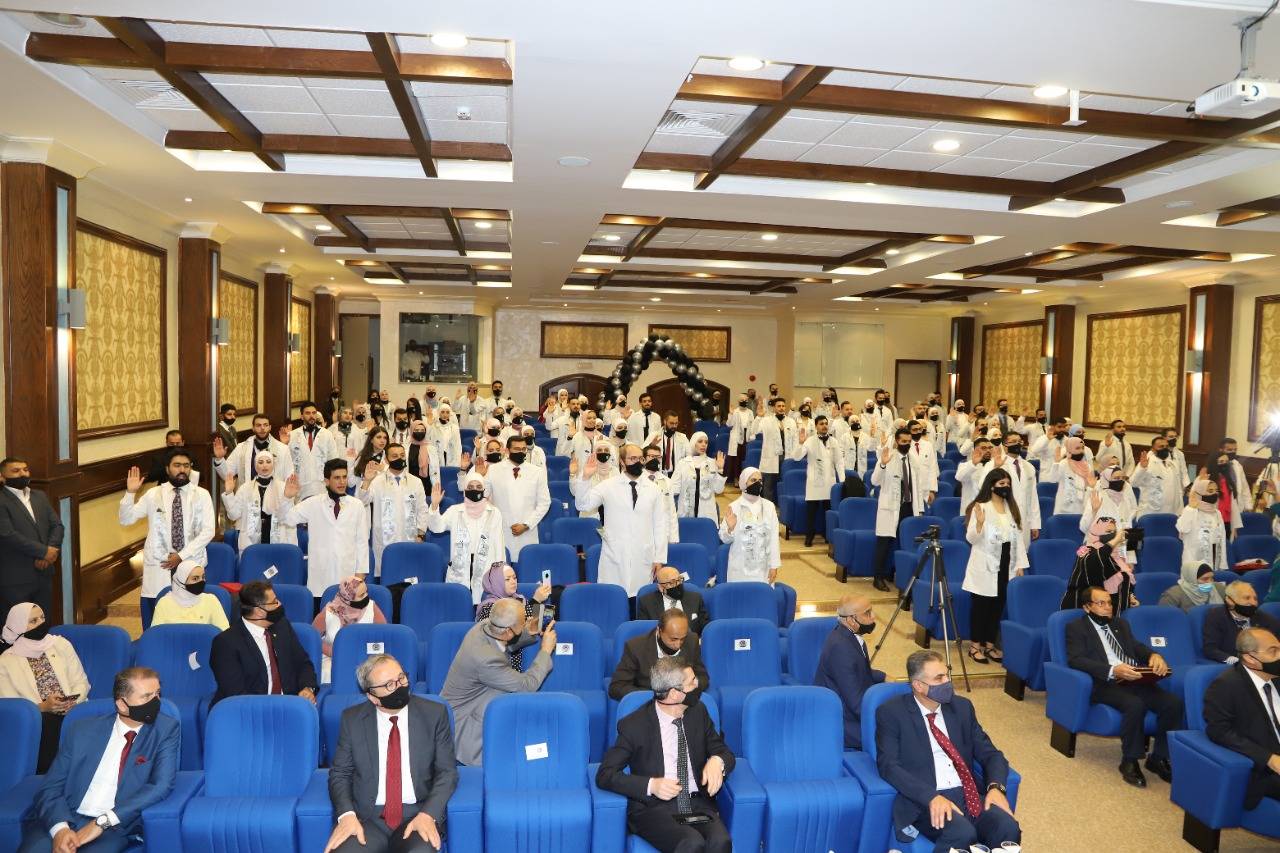 وفي ختام الحفل ردد الطلبة الخريجين قسم الطبيب والذي يركز على انسانية مهنه الطب وان يلتزم الطبيب بموجبه على صون حياة الانسان في كافه الظروف.