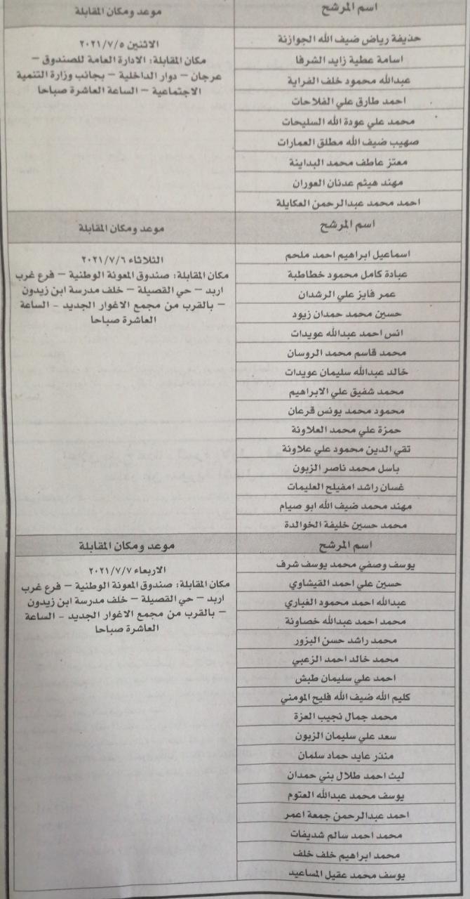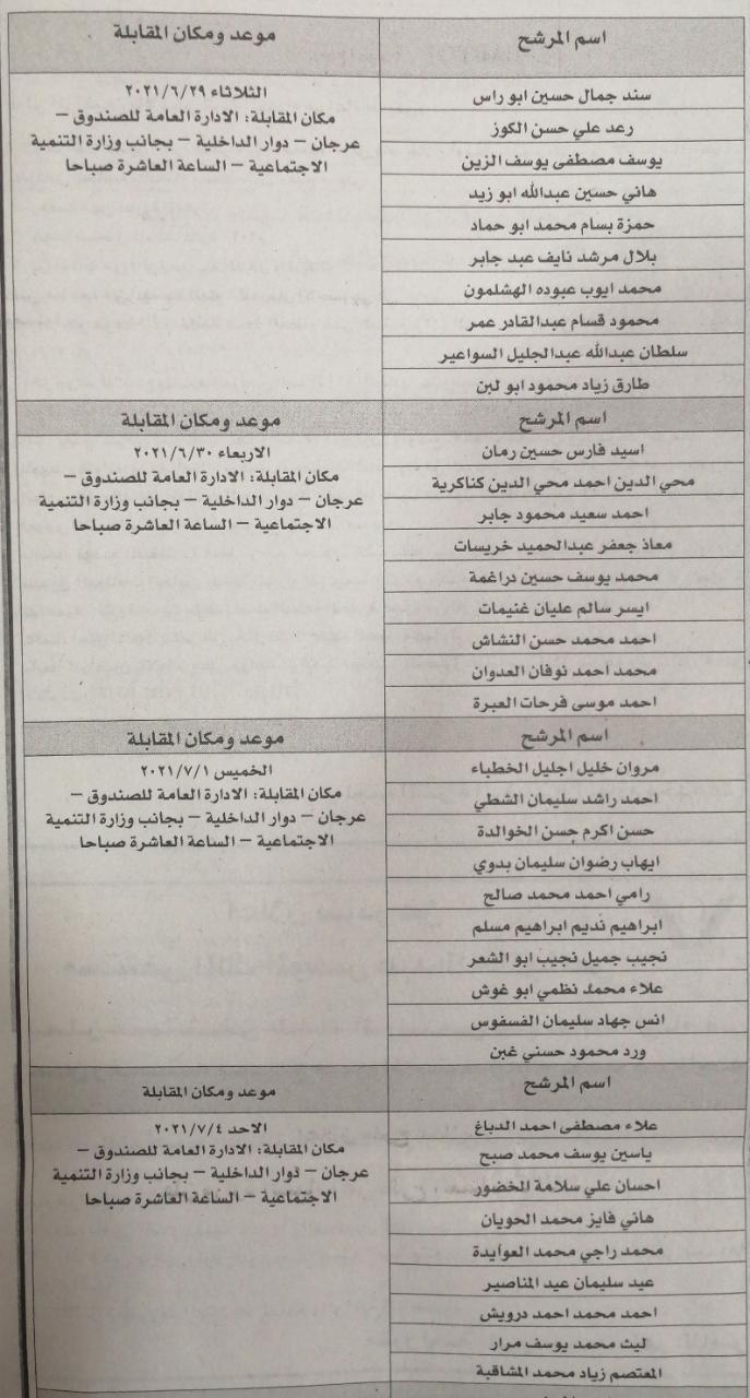 يدعو صندوق المعونة الوطنية وبالتنسيق مع ديوان الخدمة المدنية من السادة المدرجة أسماؤهم ادناه للحضور الى المكان والموعد المحدد ازاء اسم كل منهم وذلك لغايات اجراء المقابلات الشخصية لاختيار الأنسب منهم للعمل على حساب المشاريع المؤقتة ، مصطحبين معهم الهوية الشخصية :