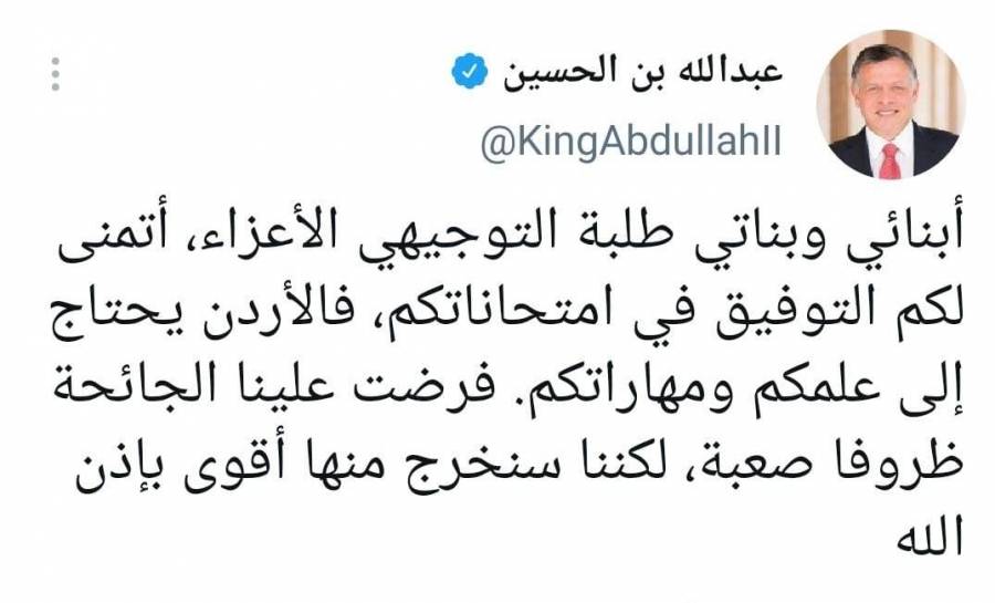 الملك عبر تويتر : أبنائي وبناتي طلبة التوجيهي الأعزاء أتمنى لكم التوفيق في امتحاناتكم فالأردن يحتاج إلى علمكم ومهاراتكم