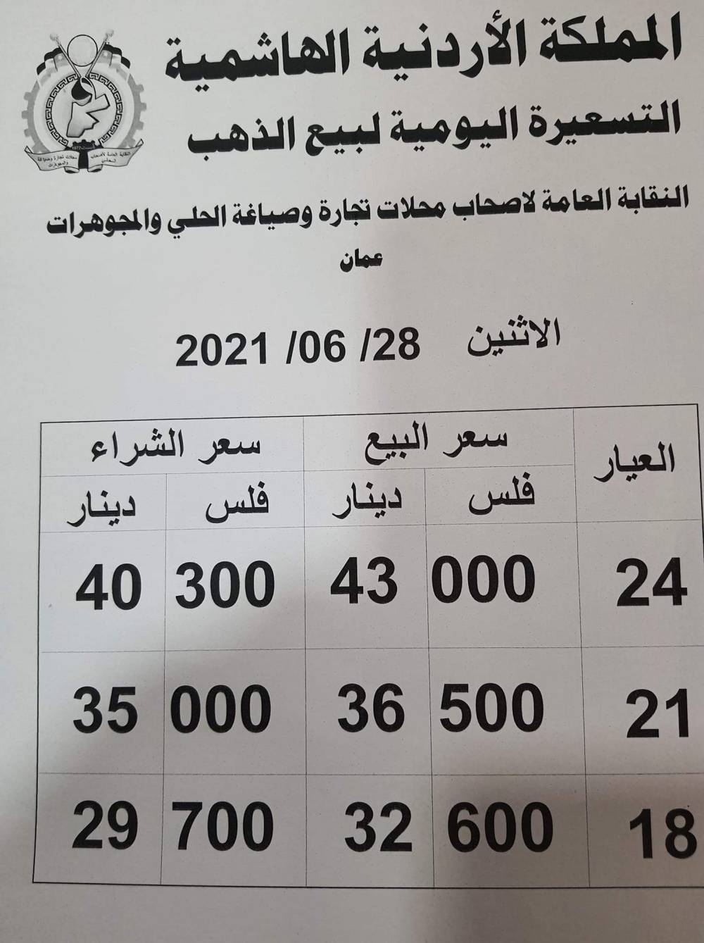 ويشمل التقريــر أسعار المعدن عيارات ( 24، 21، 18) ، كونها الأكثر تداولا في الأردن.