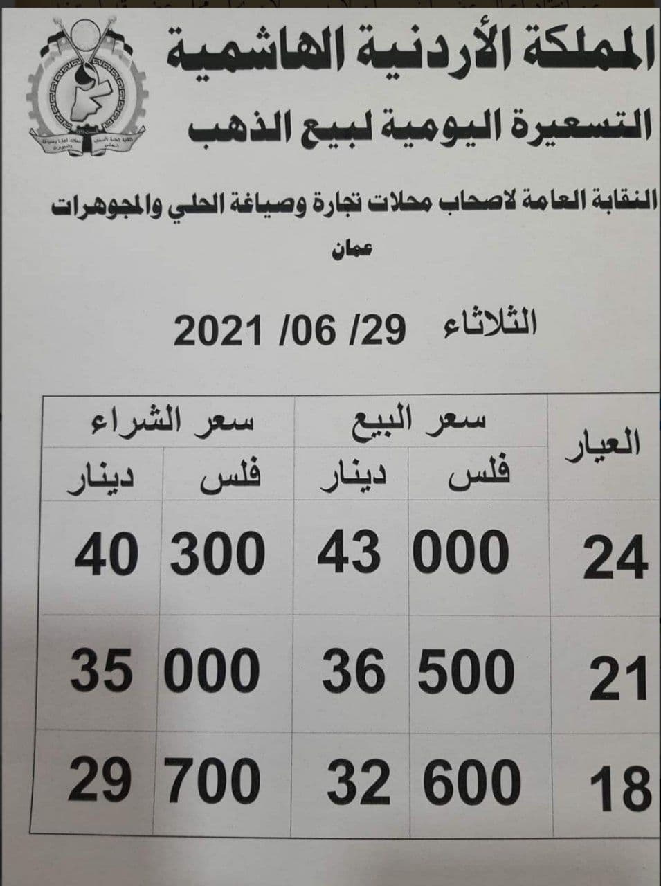 ويشمل التقريــر أسعار المعدن عيارات ( 24، 21، 18) ، كونها الأكثر تداولا في الأردن.