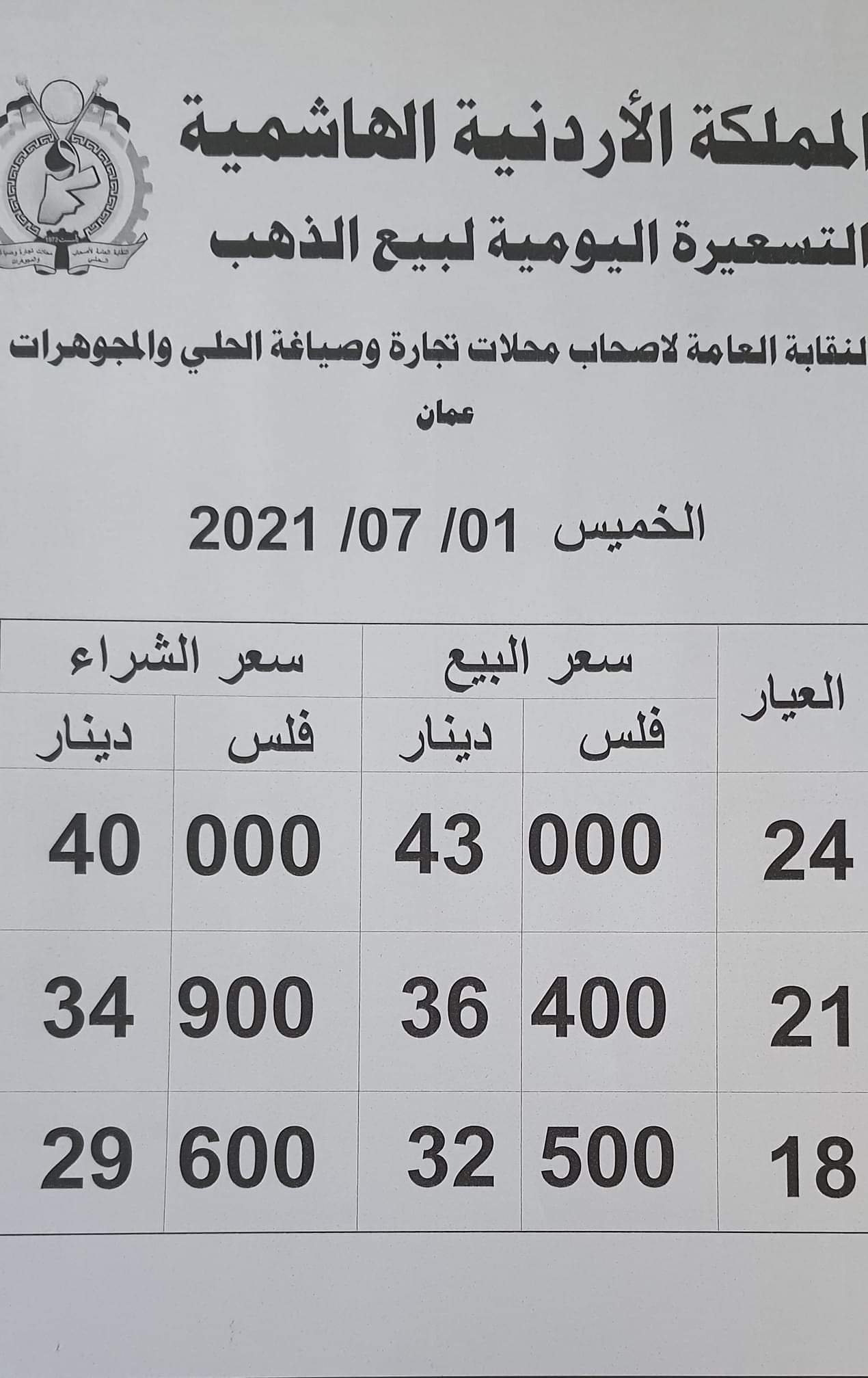 ويشمل التقريــر أسعار المعدن عيارات ( 24، 21، 18) ، كونها الأكثر تداولا في الأردن.