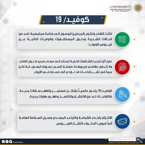 أوصى المركز الوطني للأمن وإدارة الأزمات اليوم الثلاثاء بالالتزام بالجرعتين للوصول للمناعة المجتمعية بالإضافة إلى الابتعاد عن الشائعات حول اللقاحات المضادة لفيروس كورونا.