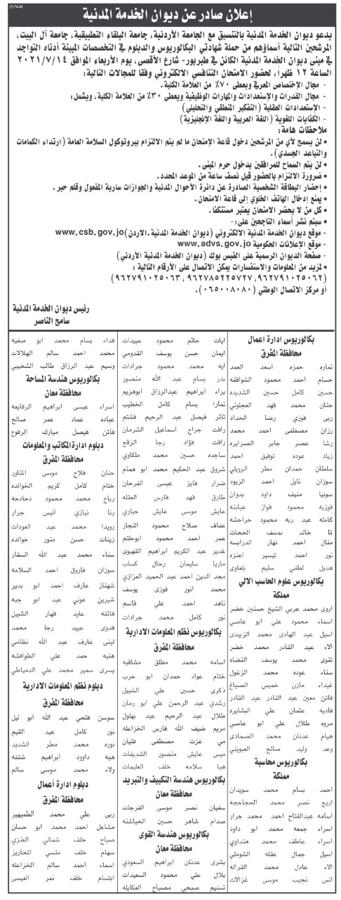 دعا ديوان الخدمة المدنية، اليوم الأربعاء، بالتنسيق مع الجامعة الأردنية وجامعة البلقاء التطبيقية وجامعة آل البيت، المرشحين أدناه، لحضور الامتحان التنافسي الالكتروني. وتاليا التفاصيل والأسماء: