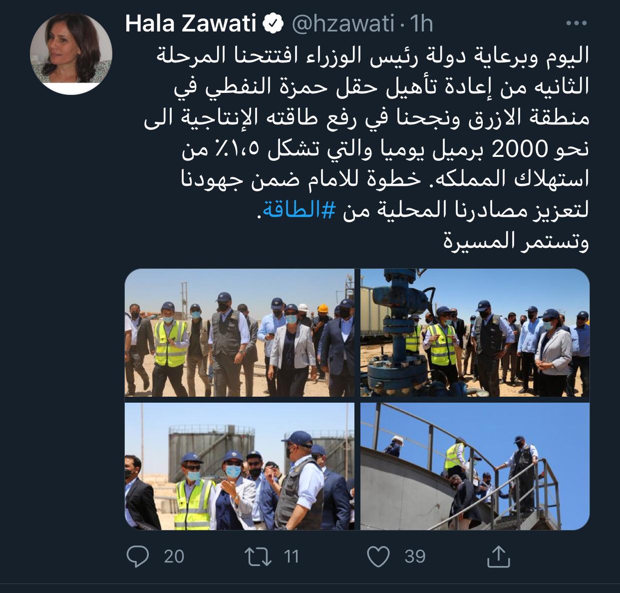 وعلقت قائلة "اليوم وبرعاية دولة رئيس الوزراء افتتحنا المرحلة الثانيه من إعادة تأهيل حقل حمزة النفطي في منطقة الازرق ونجحنا في رفع طاقته الإنتاجية الى نحو 2000 برميل يوميا والتي تشكل 1،5٪؜ من استهلاك المملكه. خطوة للامام ضمن جهودنا لتعزيز مصادرنا المحلية من #الطاقة".