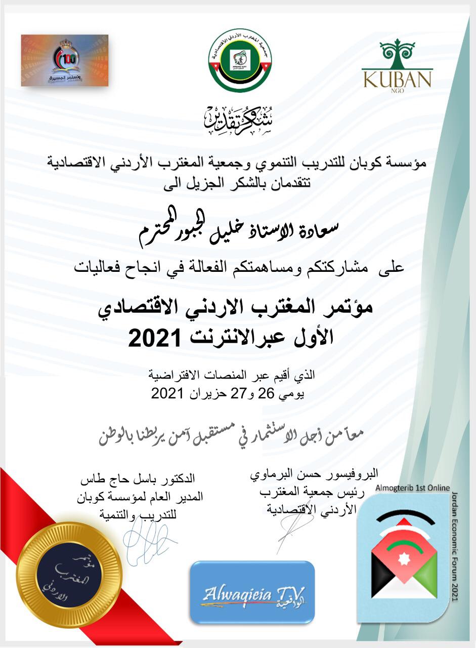 أعربت مؤسسة كوبان للتدريب التنموي الذي يشغل حاليًا مديرًا عامًا لها الدكتور باسل حاج طاس و جمعية المغترب الاردني الاقتصادية الذي يشغل حالياً رئيسًا لها البروفيسور حسن البرماوي اليوم الأربعاء عن شكرهما لمدير عام وكالة نيروز الاخبارية الاعلامي خليل سند العقيل الجبور لمشاركته ومساهمته الفعالة في انجاح فعاليات مؤتمر المغترب الاردني الاقتصادي الاول عبر الانترنت لعام 2021 .