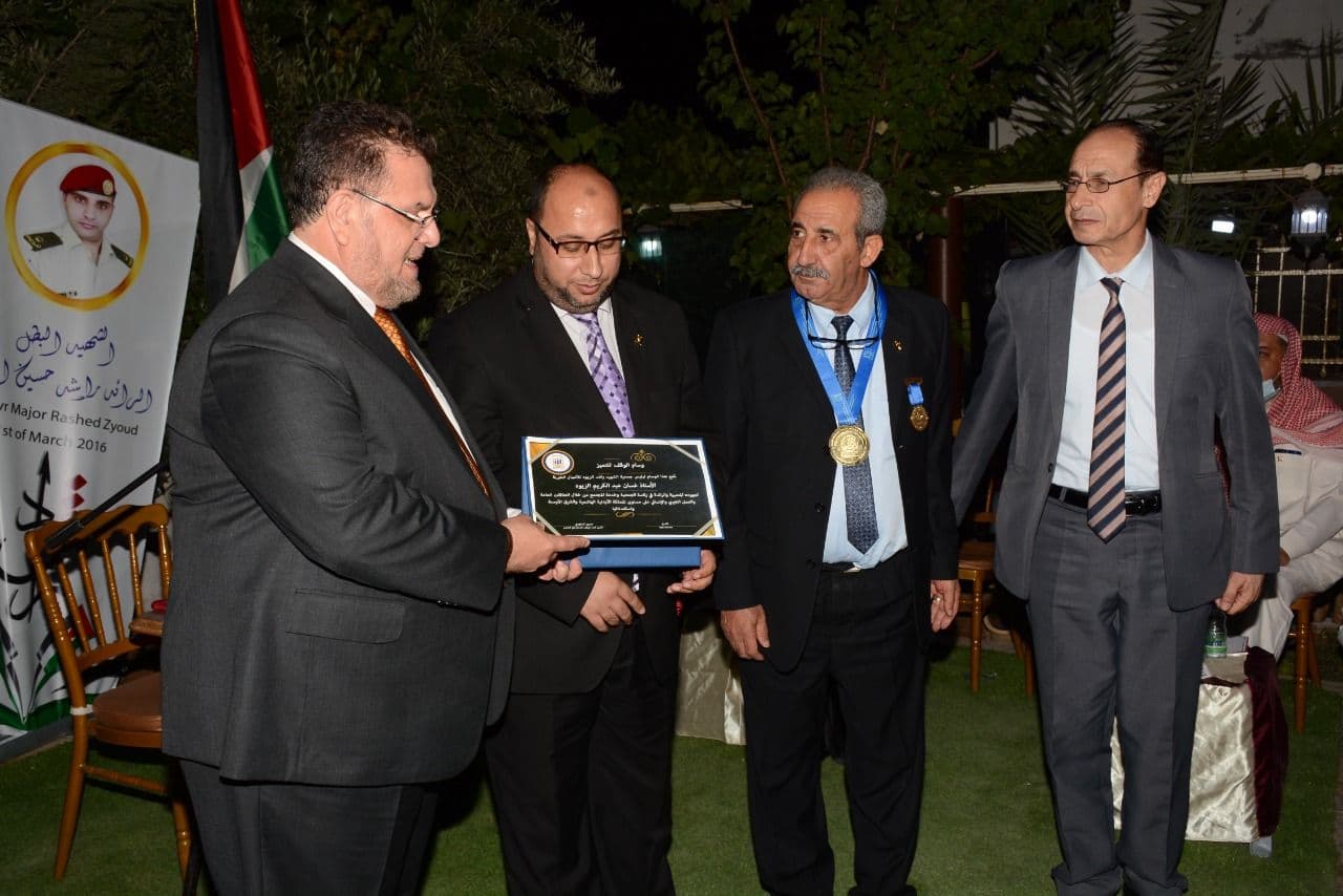 منح الأمين العام للوقف اسكندنافي للتعليم في السويد الأستاذ حسين الداودي كل من اللواء(م) حسين راشد الزيود رئيس مجلس أمناء جمعية الشهيد راشد الزيود للأعمال الخيرية والتنموية والأستاذ غسان الزيود رئيس الجمعية ، وسام الوقف للتميز تقديراً لجهود جمعية الشهيد راشد في خدمة المجتمعات من خلال العمل الخيري والإنساني.