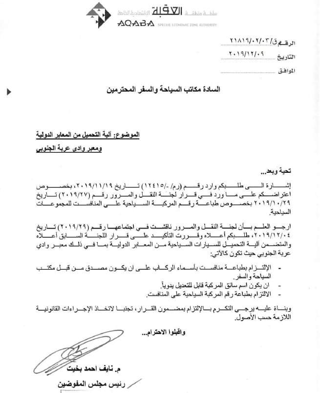 ثانيا :- وردت العديد من الملاحظات والشكاوى إلى سلطة منطقة العقبة الإقتصادية الخاصة سابقا (قبل جائحة كورونا) من الجهات ذات العلاقة في معبر جنوب وادي عربة (السياح والزوار، شركات النقل السياحي المتخصص، مكاتب تأجير السيارات السياحية،مكاتب التكسي) حول الممارسات السلبية التي يمارسها بعض المشغلين أثناء تحميل الركاب القادمين عبر المعابر الحدودية وتم تحويلها إلى لجنة المرور والنقل.