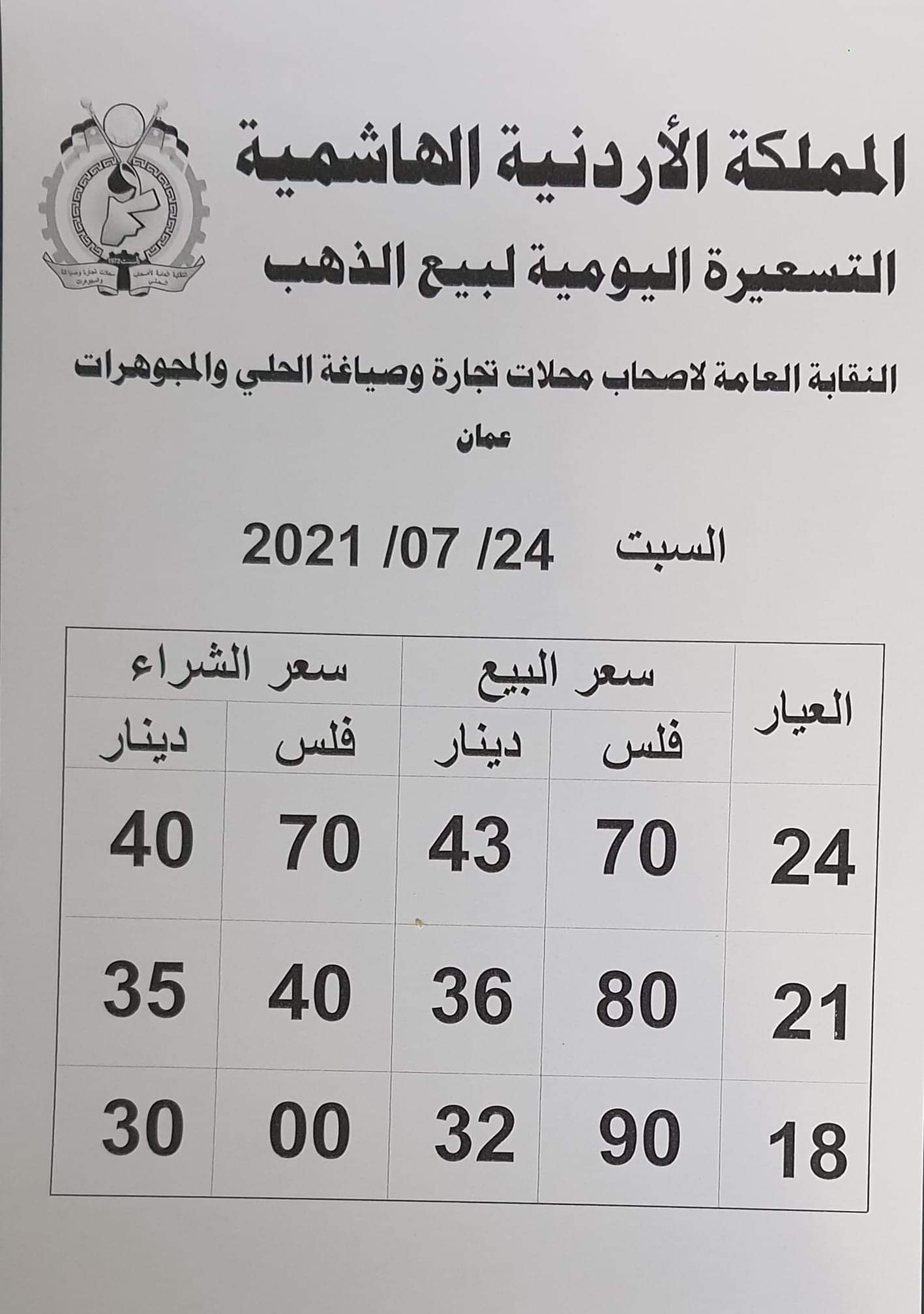 ويشمل التقريــر أسعار المعدن عيارات ( 24، 21، 18) ، كونها الأكثر تداولا في الأردن.