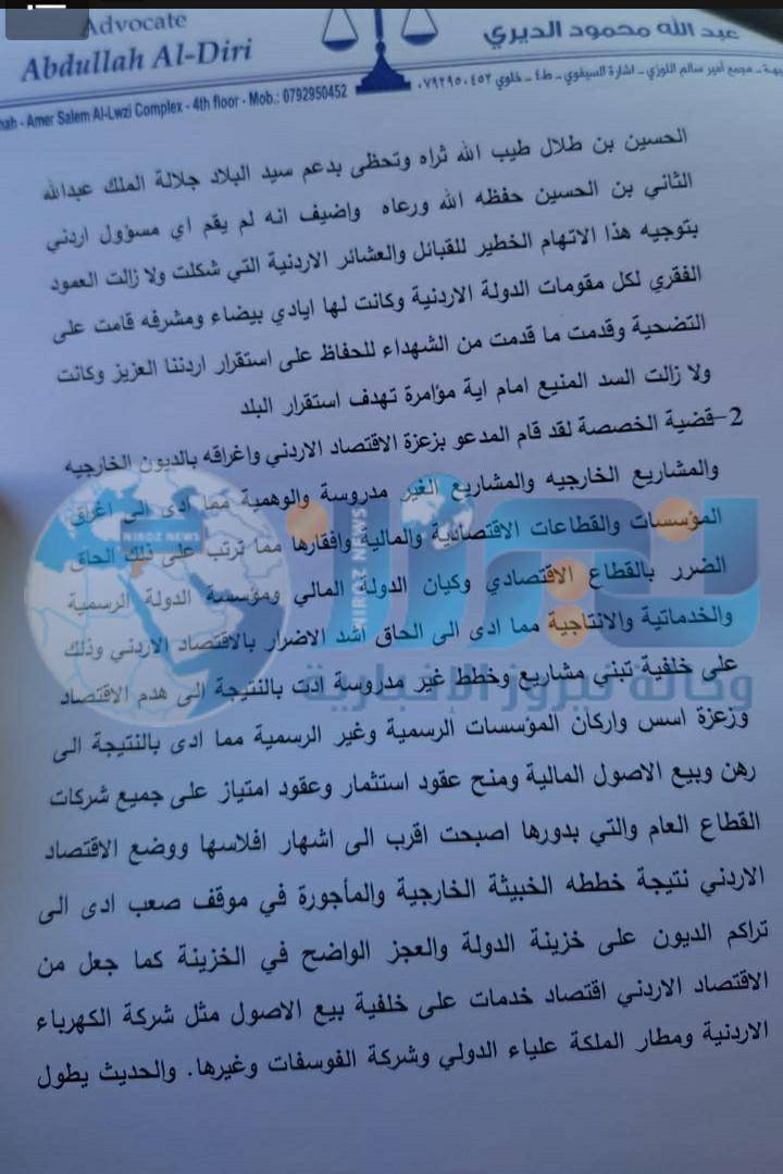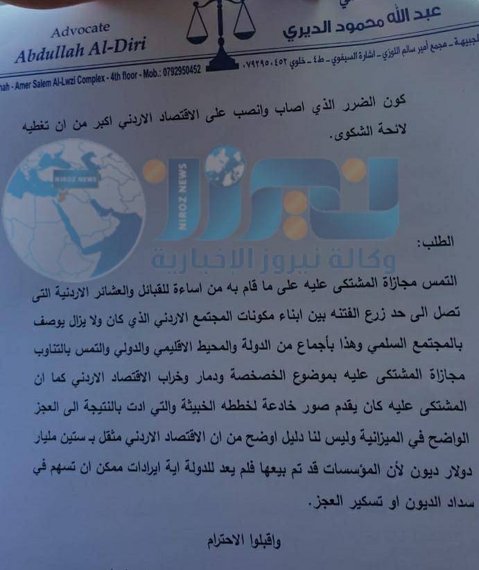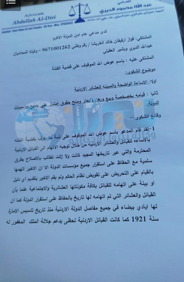 الخريشا يرفع دعوى قضائية ضد باسم عوض الله لدى محكمة شمال عمان... "وثيقة "