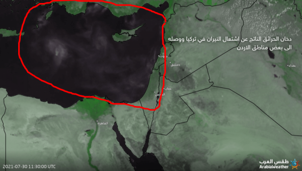 وانتشر دخان الحرائق في حوض شرق البحر الأبيض المتوسط وصولاً إلى بعض مناطق الأردن من خلال طبقات الجو العليا، وفق موقع طقس العرب.