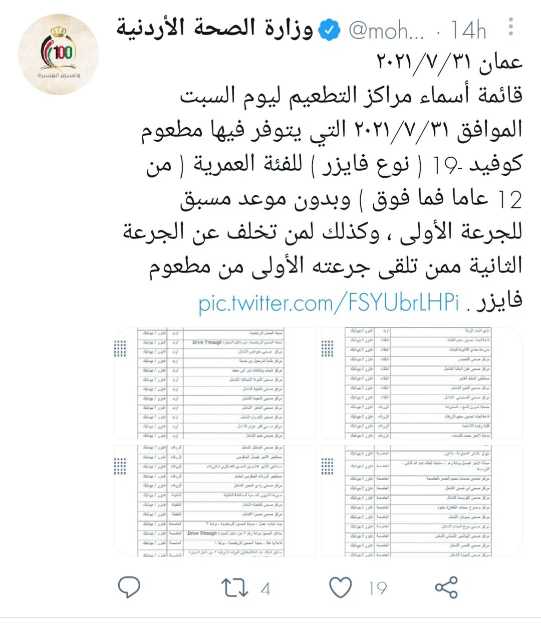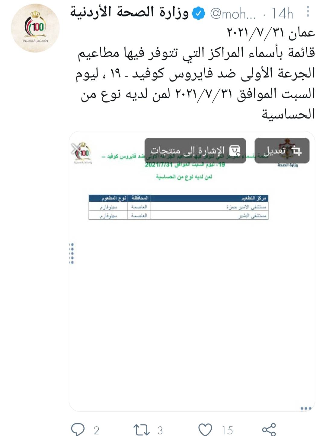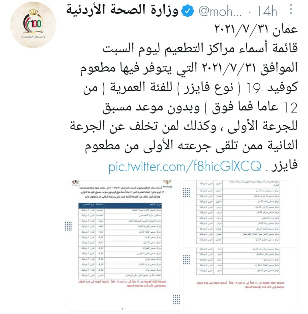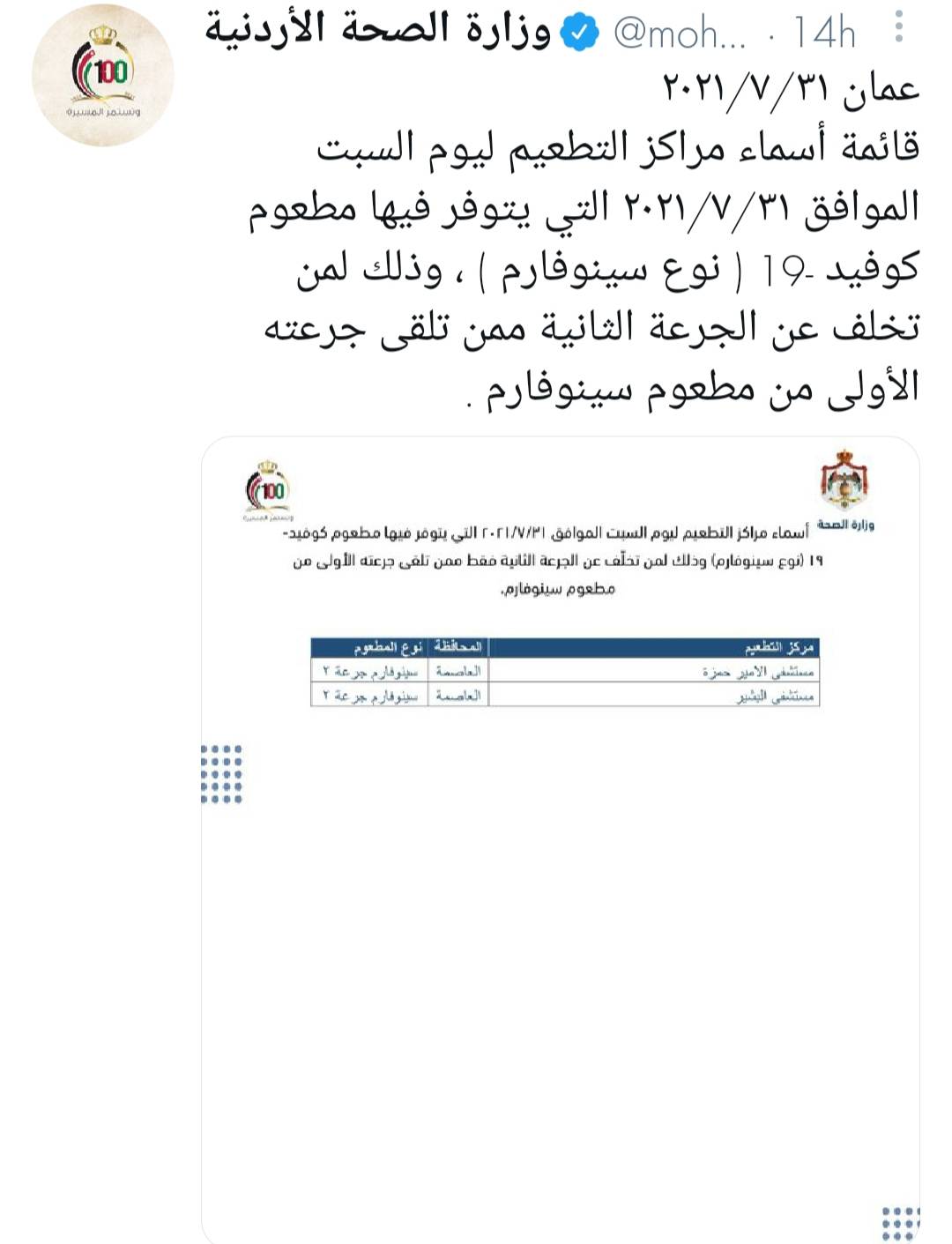 وكذلك، نشرت الوزارة أسماء مراكز يتوفر فيها مطعوم كورونا نوع سينوفارم الصيني، وذلك "لمن تخلف عن الجرعة الثانية ممن تلقى جرعته الأولى من مطعوم سينوفارم".