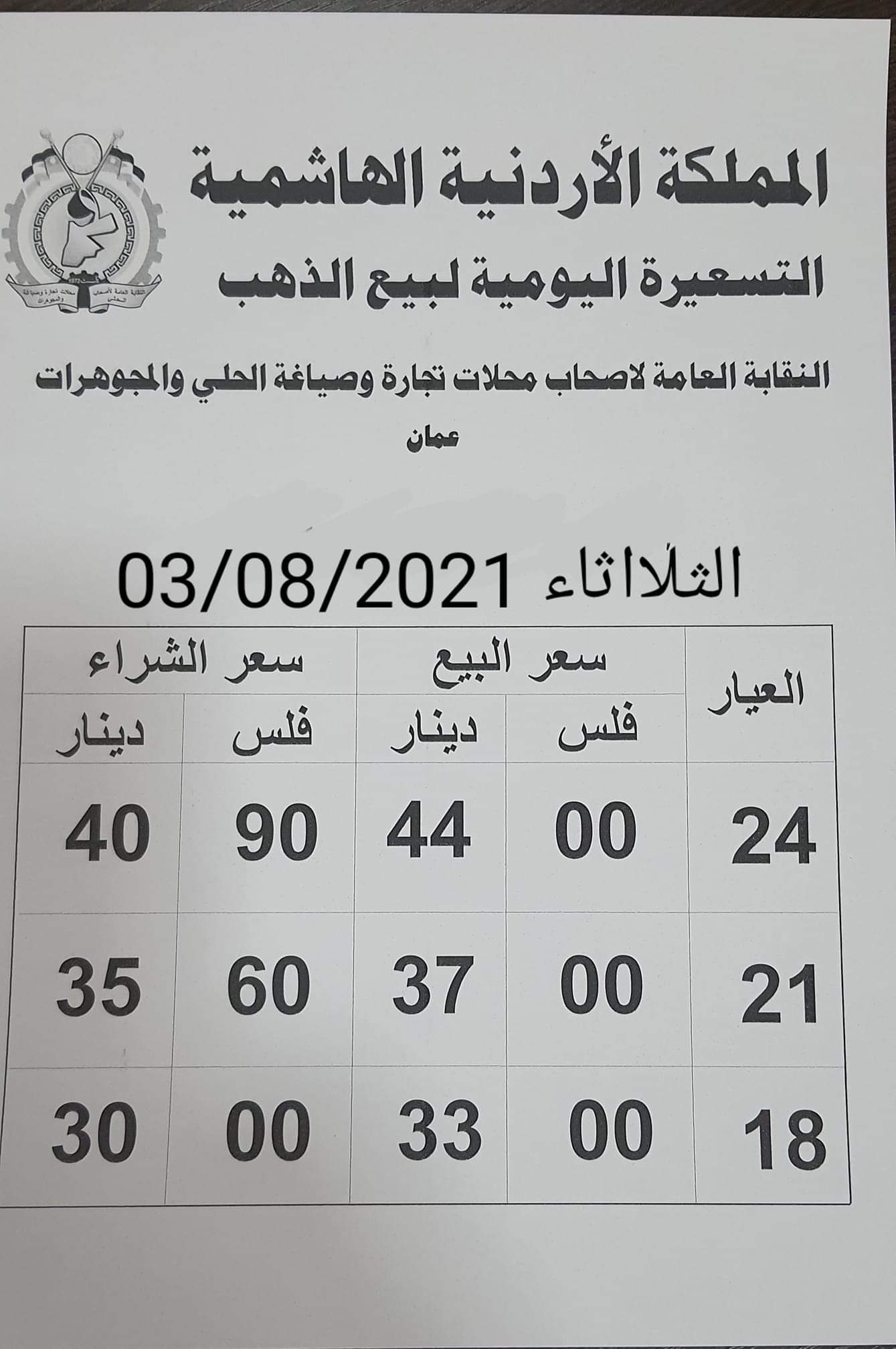 ويشمل التقريــر أسعار المعدن عيارات ( 24، 21، 18) ، كونها الأكثر تداولا في الأردن.