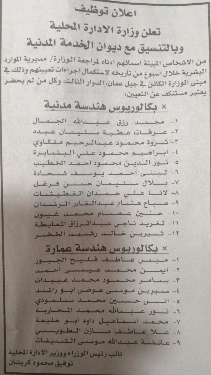 دعت وزارة الادارة المحلية وبالتنسيق مع ديوان الخدمة المدنية مرشحين لاستكمال اجراءات التعيين   خلال أسبوع .