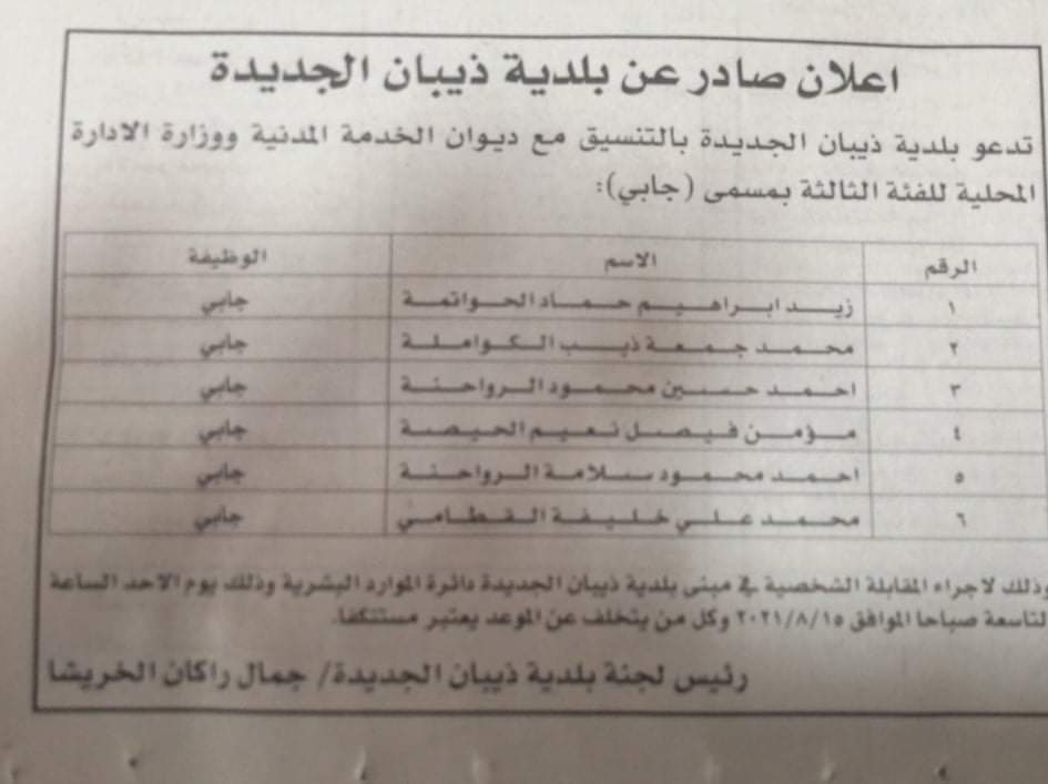 بلدية ذيبان الجديدة تدعو مرشحين للتعيين على الفئة الثالثة لاجراء مقابلة شخصية ..."اسماء "