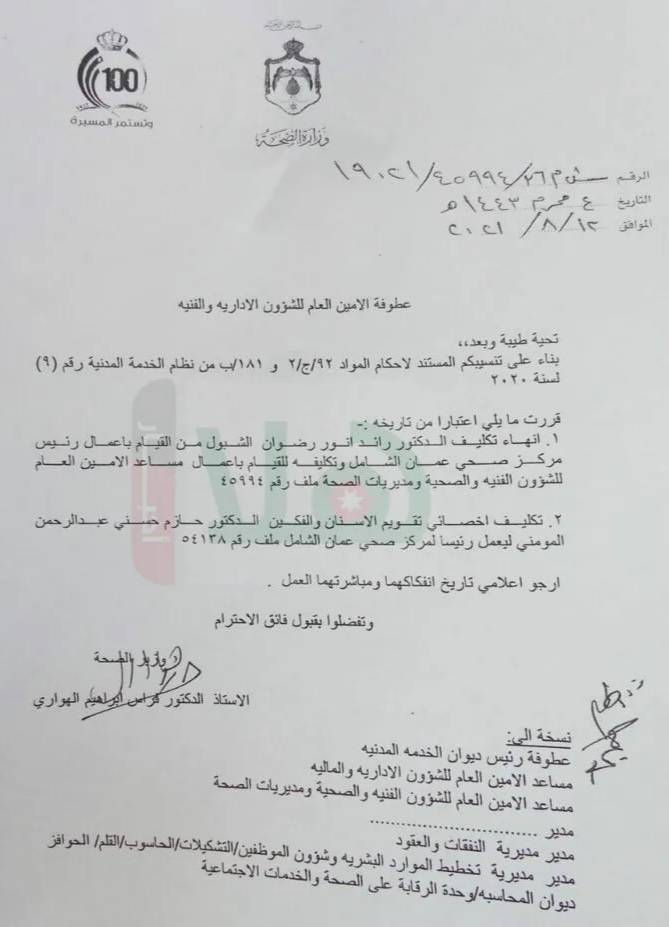كما قرر الهواري إنهاء تكليف الشبول من القيام بأعمال مركز صحي عمان الشامل.