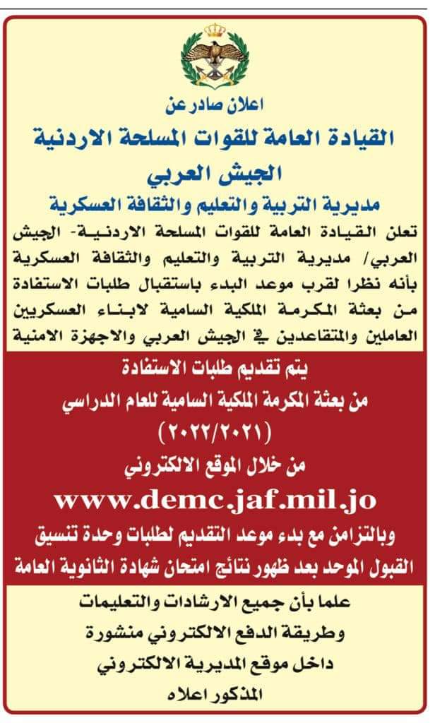 اعلان صادر عن مديرية التربية والتعليم والثقافة العسكرية