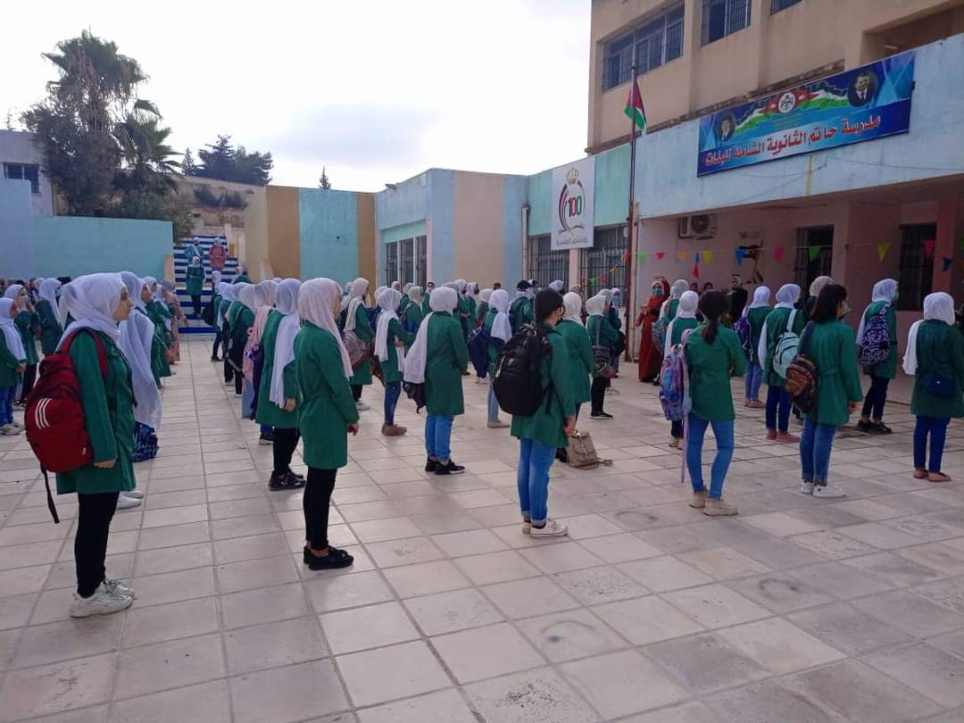 اما في مدرسة حاتم الثانوية للبنات فكان اللقاء مختلفا , حيث استقبلت مديرة المدرسة الفاضلة مجدولين العقيلي  والهيئة التدريسية الطالبات بالورود وتقديم الماء والحلويات والابتسامة لاتفارق وجوههن مع التاكيد المستمر على التباعد الجسدي وارتداء الكمامة واستخدام المعقمات وغيرها من الامور .