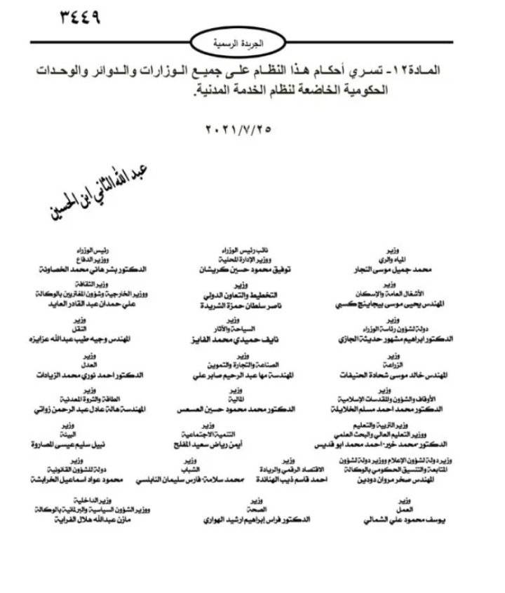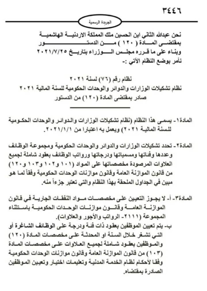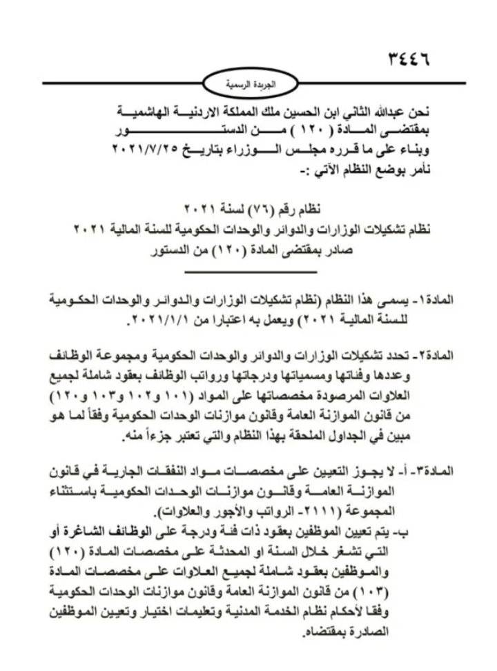 صدر في الجريدة الرسمية نظام تشكيلات الوزارات والدوائر والوحدات الحكومية للسنة المالية 2021.
