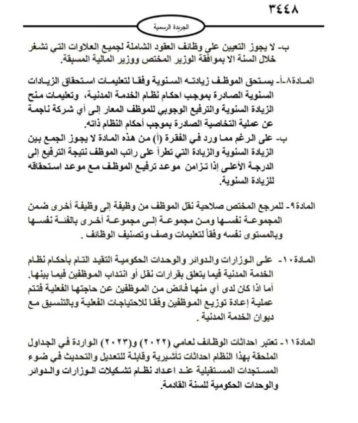 ووفق النظام المنشور في عدد الخميس، فإنه تحدد تشكيلات الوزارات والدوائر والوحدات الحكومية ومجموعة الوظائف وعددها وفئاتها ومسمياتها ودرجاتها ورواتب الوظائف بعقود شاملة لجميع العلاوات المرصودة من قانون الموازنة العامة وقانون موازنات الوحدات الحكومية.