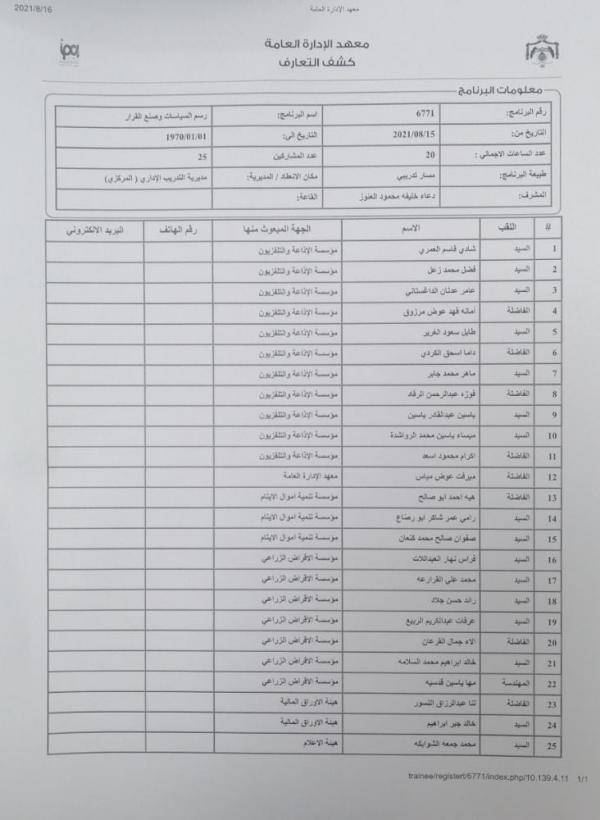 وقدم الدورة الأستاذ المدرب محمد الرعود واشرف عليها اداريا دعاء العنوز وشارك فيها 25 موظفة وموظفا عاما من عدة مؤسسات حكومية هي: مؤسسة الإذاعة والتلفزيون الأردني، ومؤسسة الإقراض الزراعي، ومؤسسة تنمية أموال الأيتام، وهيئة الأوراق المالية ومعهد الإدارة العامة.
