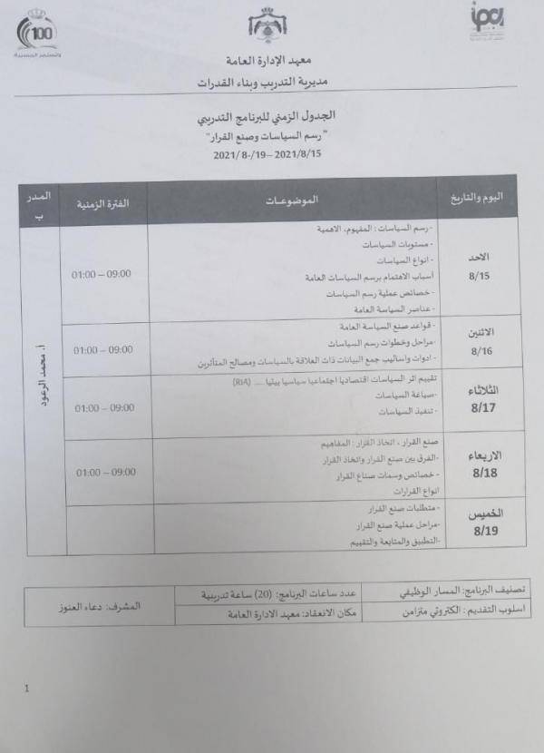 نيروز الإخبارية : اختتمت، الخميس، الدورة التدريبية التي نظمها معهد الإدارة العامة الحكومي الأردني لمدة أسبوع في الفترة ما بين 15 الى 19 آب تحت عنوان رسم السياسات وصنع القرار، وذلك عبر تقنية الاتصال المرئي.